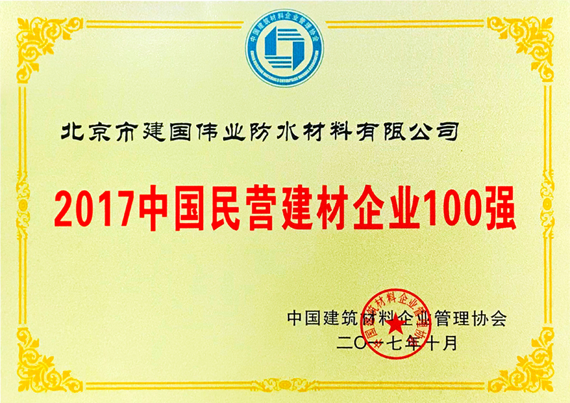 中國建筑材料企業(yè)管理協(xié)會于2017年10月26日在北京召開了2017年度中國建材企業(yè)500強、建筑服務業(yè)100強、民營建材企業(yè)100強和最具成長性建材企業(yè)100和園區(qū)20強暨防水技術(shù)交流會,來自全國各地的近千余名會員代表出席了會議。會議上,建國偉業(yè)榮獲“2017中國民營建材企業(yè)100強”稱號。